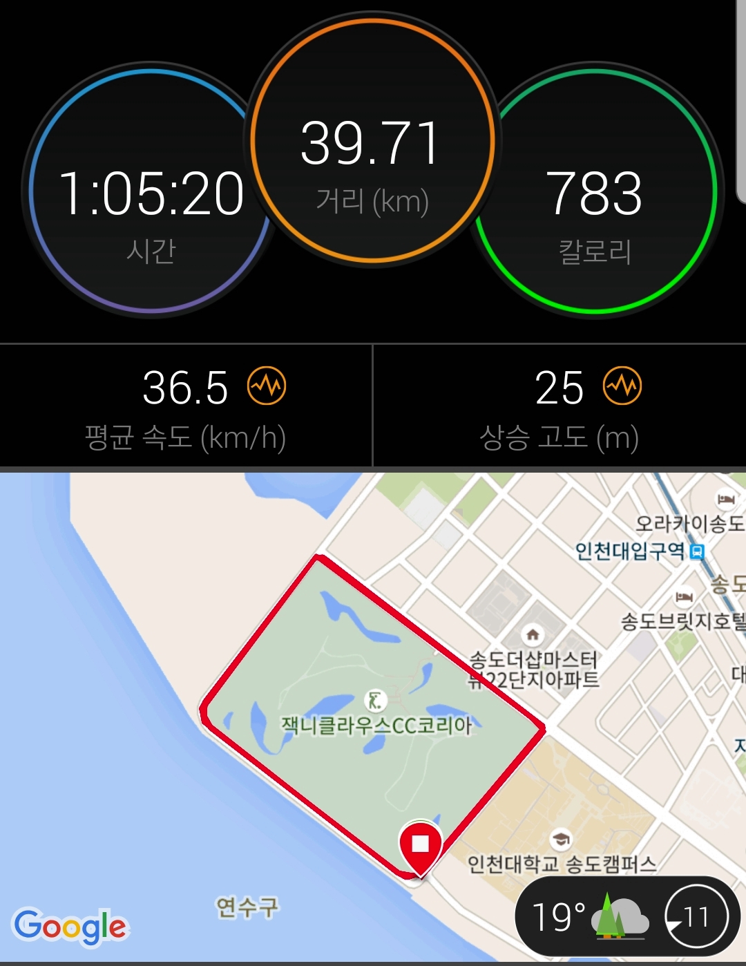 안개비로 인해 한기를 느껴 몸풀기 용으로 19시 34분 잭니클라우스 한바퀴 돌아 봄...