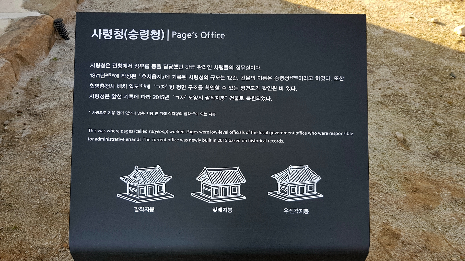 사령청 또는 승령청(팔작지붕 건물)... 사령청은 관청에서 심부름 등을 담당했던 하급 관리인 사령들의 집무실...