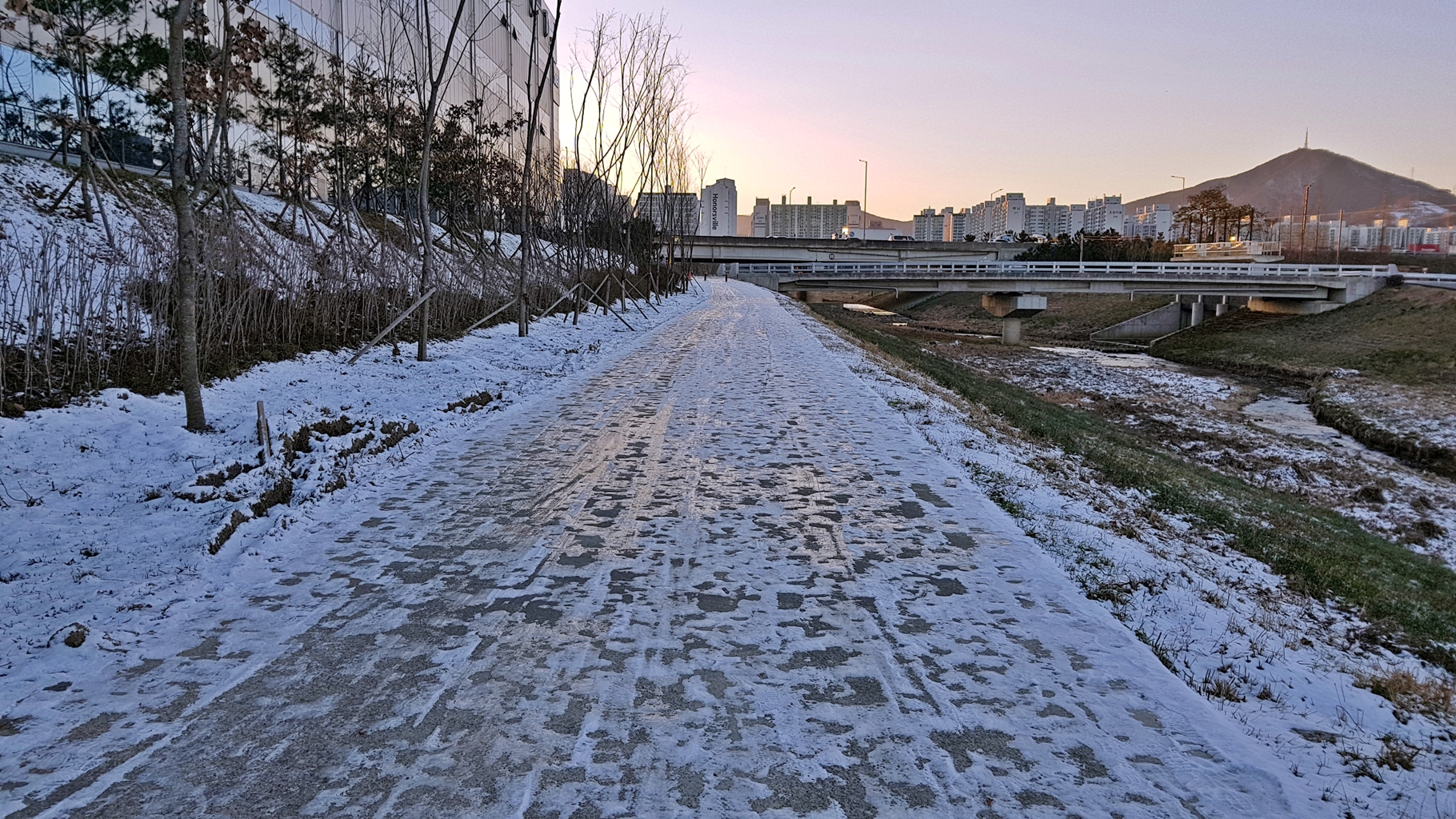 13일 눈 내린 것으로 인해 그늘진 곳 몇 곳은 이렇게 눈과 빙판길이...
