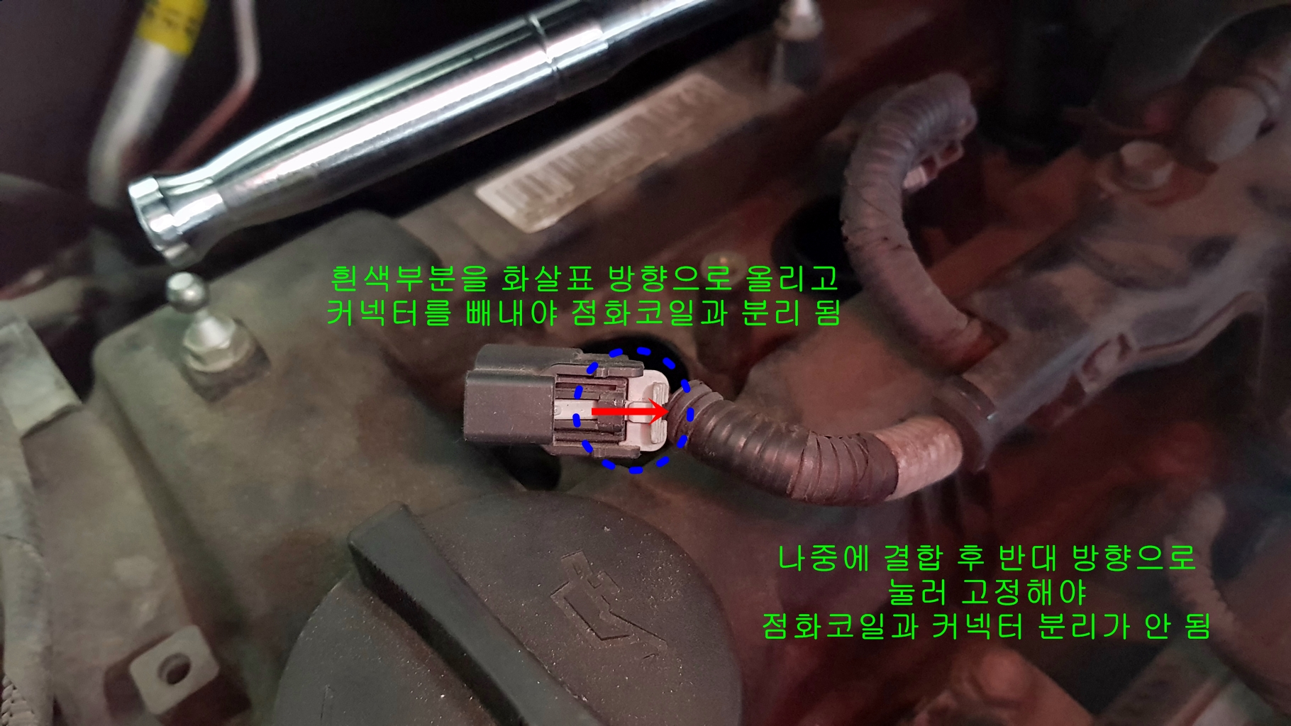 점화코일 커넥터 분리는 화살표 표시 된 흰색 부분을 잡아 뽑고 커넥터 분리를 해야 분리가 됨...