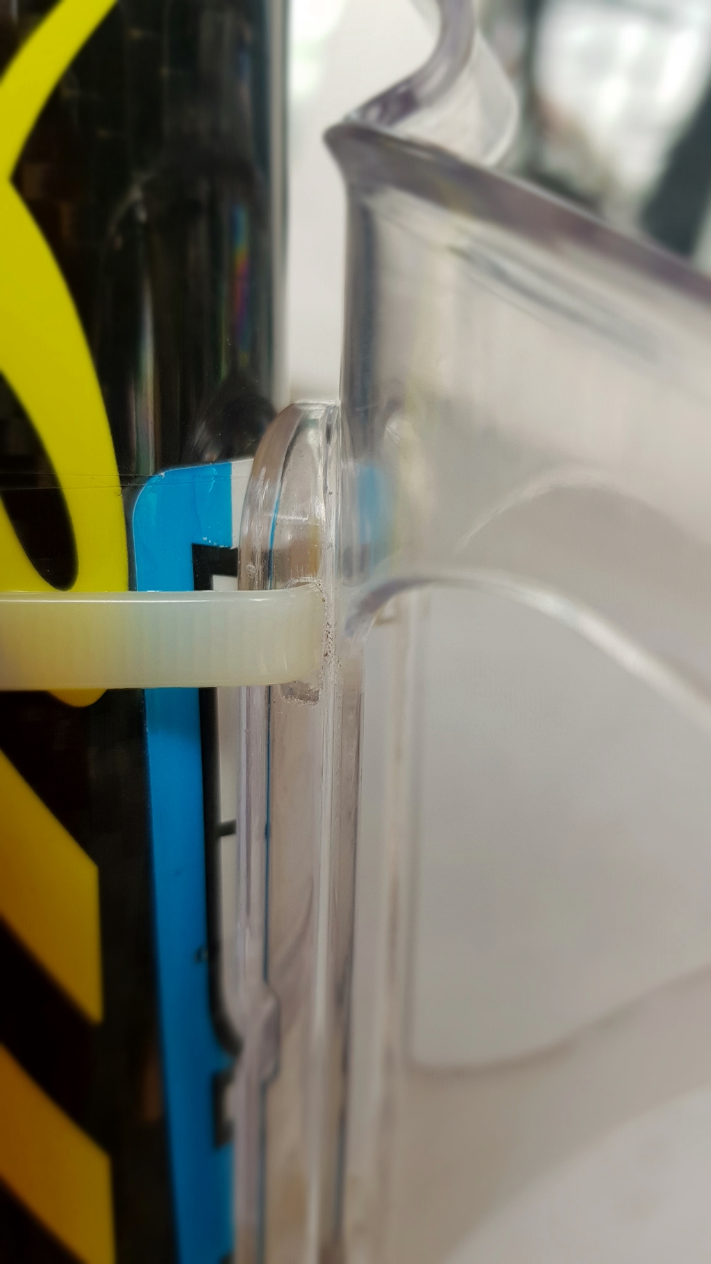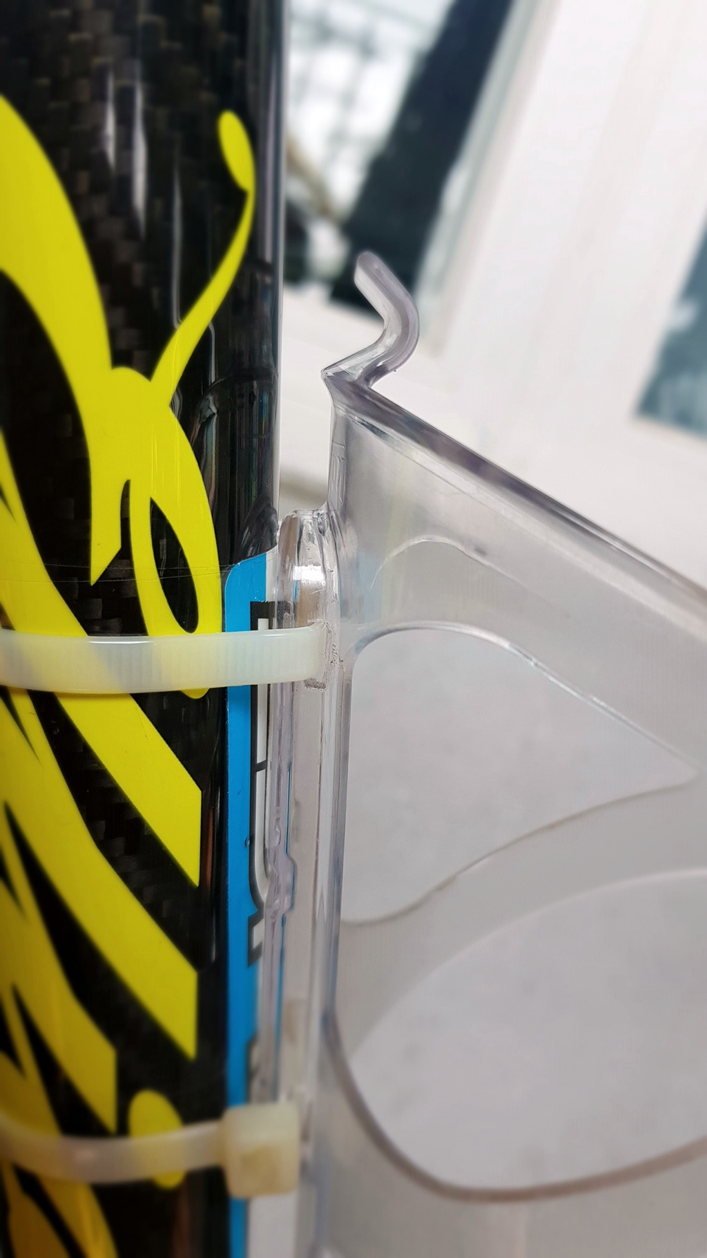 물통케이지에 구멍을 내 물통케이지와 프레임 사이 고정에 도움이 되라고 양면 테이프 붙이고 케이블 타이로 묶음...