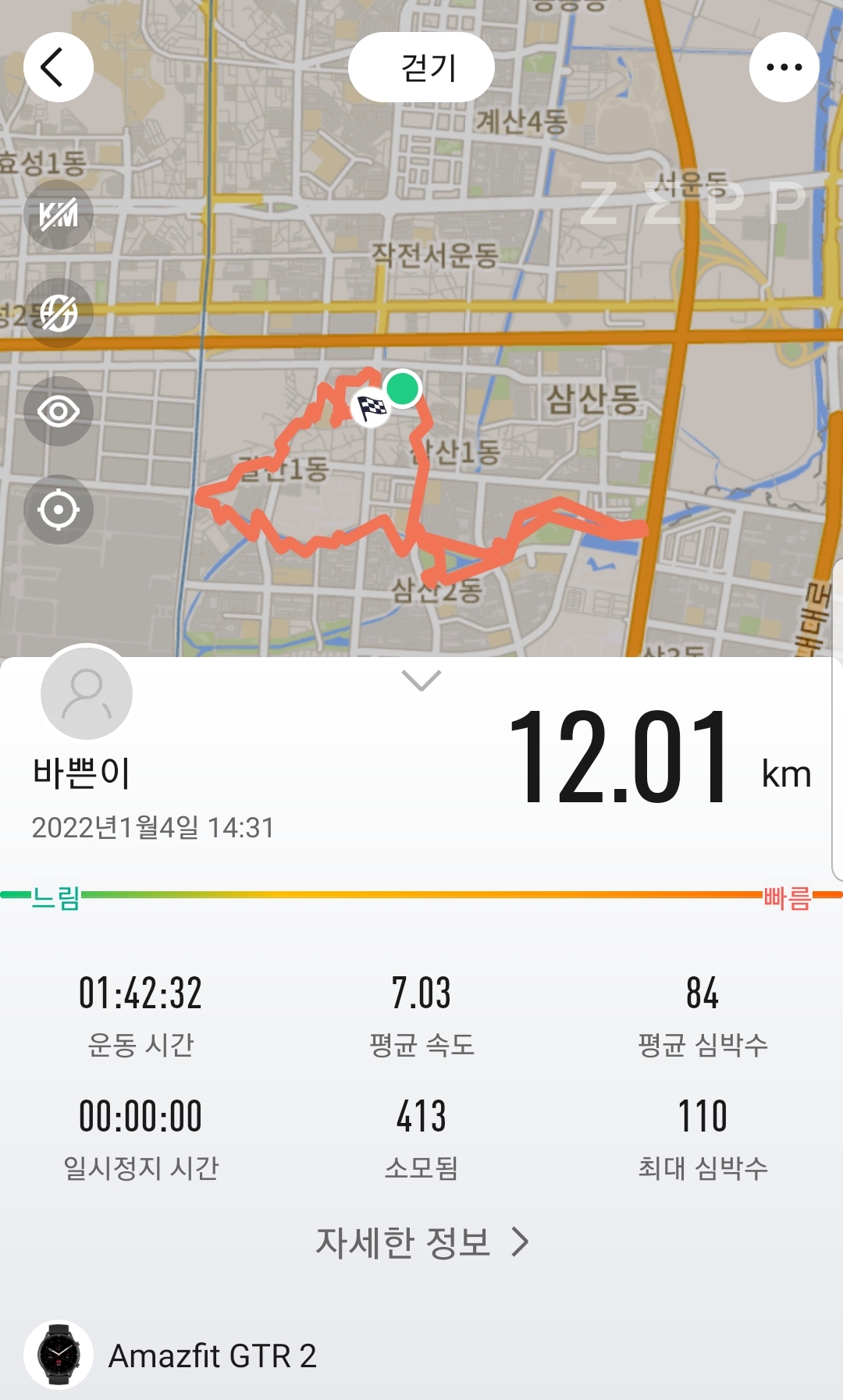 어메이즈핏 GTR2에 기록된 것을 보니 평균속도가 좀...