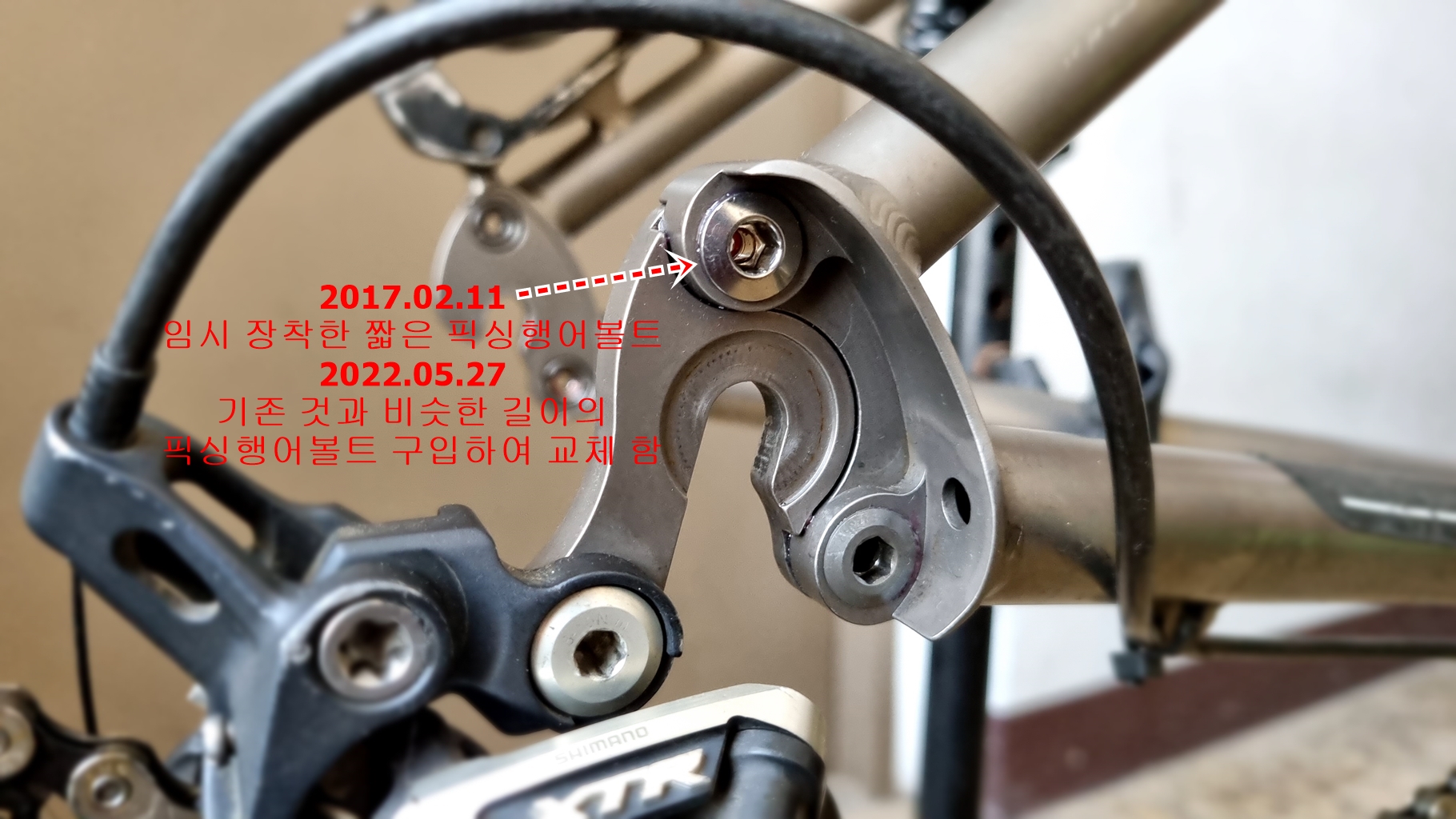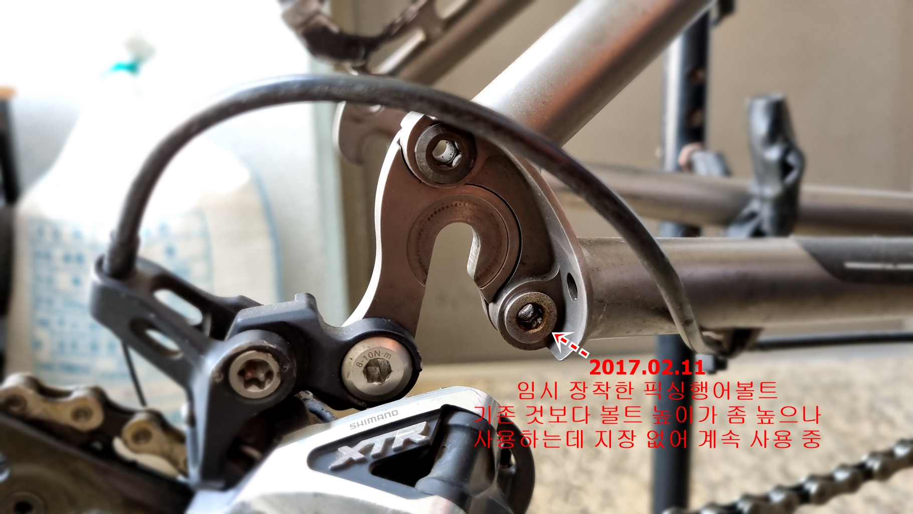 2017.02.11 뒷드레일러 쪽 픽싱행어볼트 없어진거 확인 후 외경 맞는거 급구해 장착 후 사용 중...