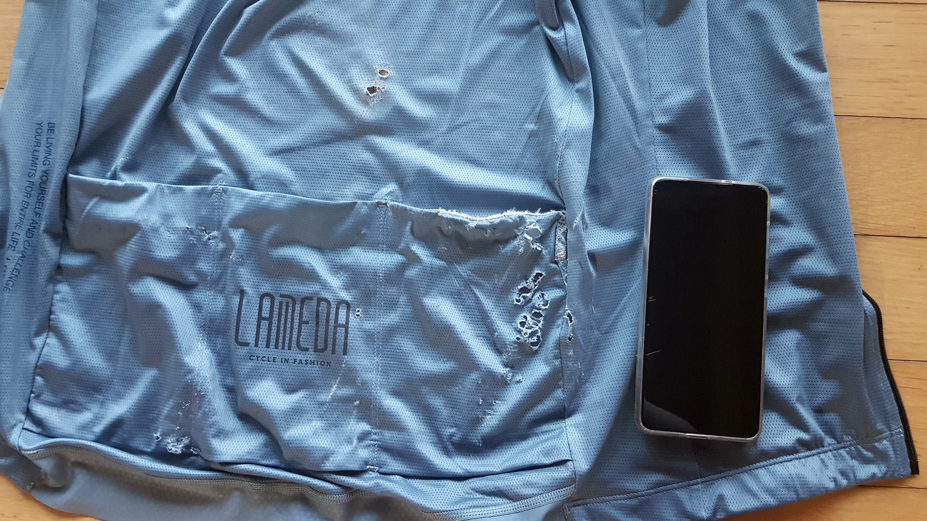 져지 등과 뒤 주머니 쪽이 찢겨 버려야 될 정도에 클릿슈지 왼쪽 옆 갈리고 오른쪽 앞쪽 들리고, 핸드폰 액정 흠집까지...