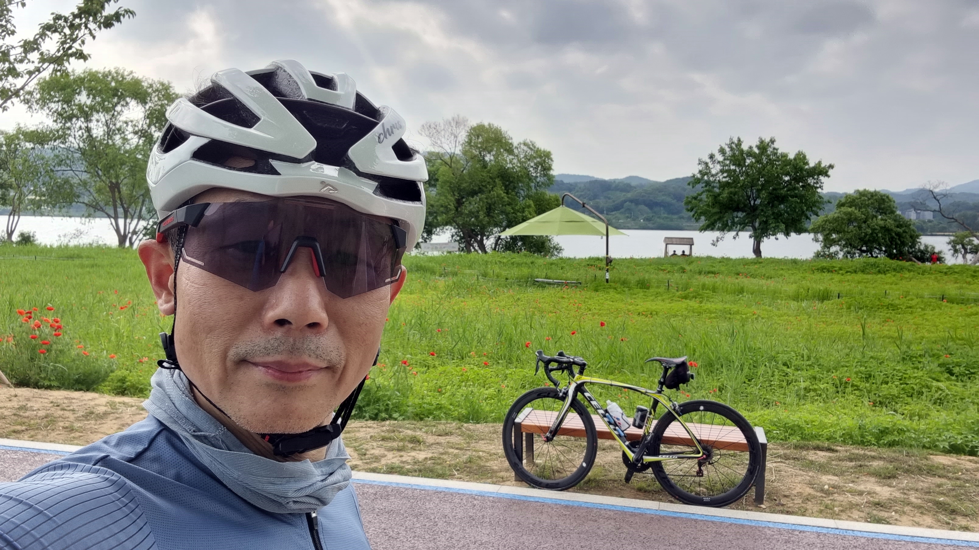 (아무도 없고 요철도 없는 직선구간 자전거도로에서 아무생각 없이 고글 다시 고쳐 쓰려 했다가 핸들 꺽이며 낙차...)