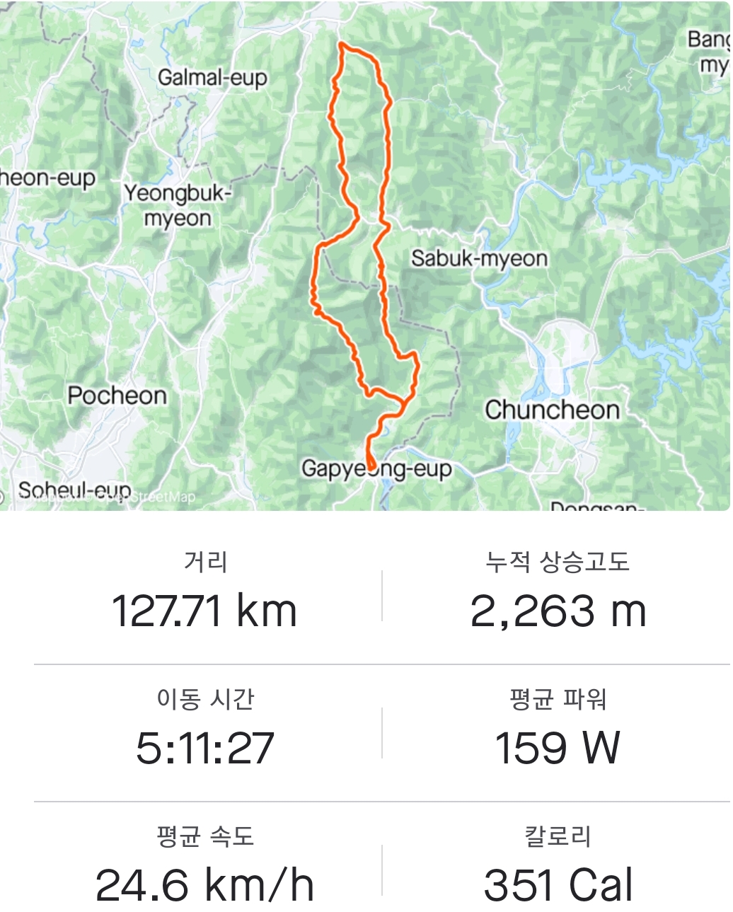 마지막 도마치재 다운 이후 3~4번 정도 왼쪽 허벅지에 쥐가 남(댄싱으로 어거지로 해결)...