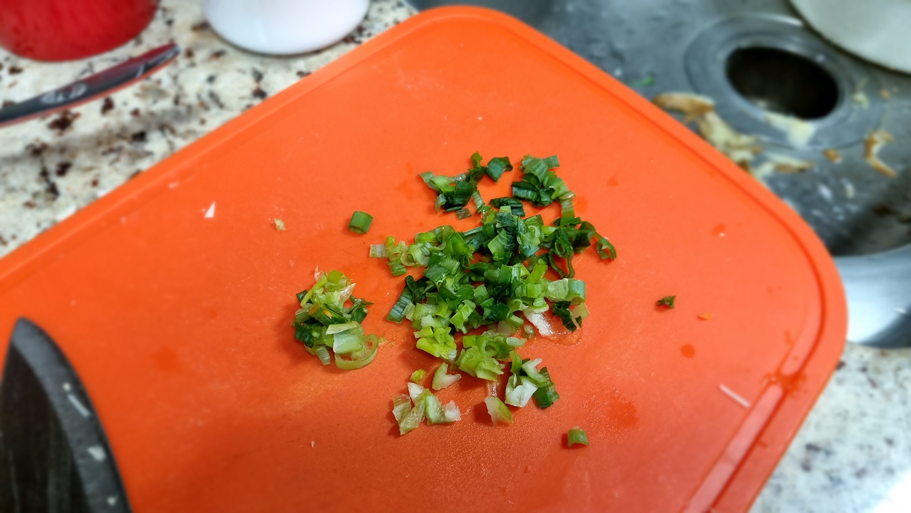 죽 끓이는 중인 냄비와 남은 재료인 계란과 파를 사진에 담음...