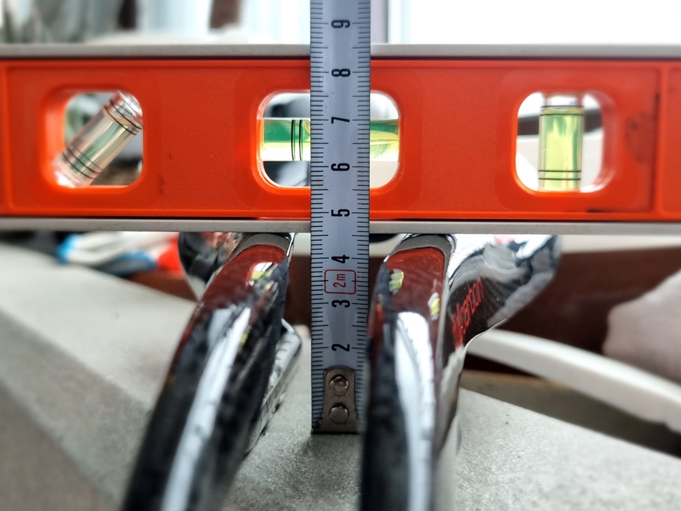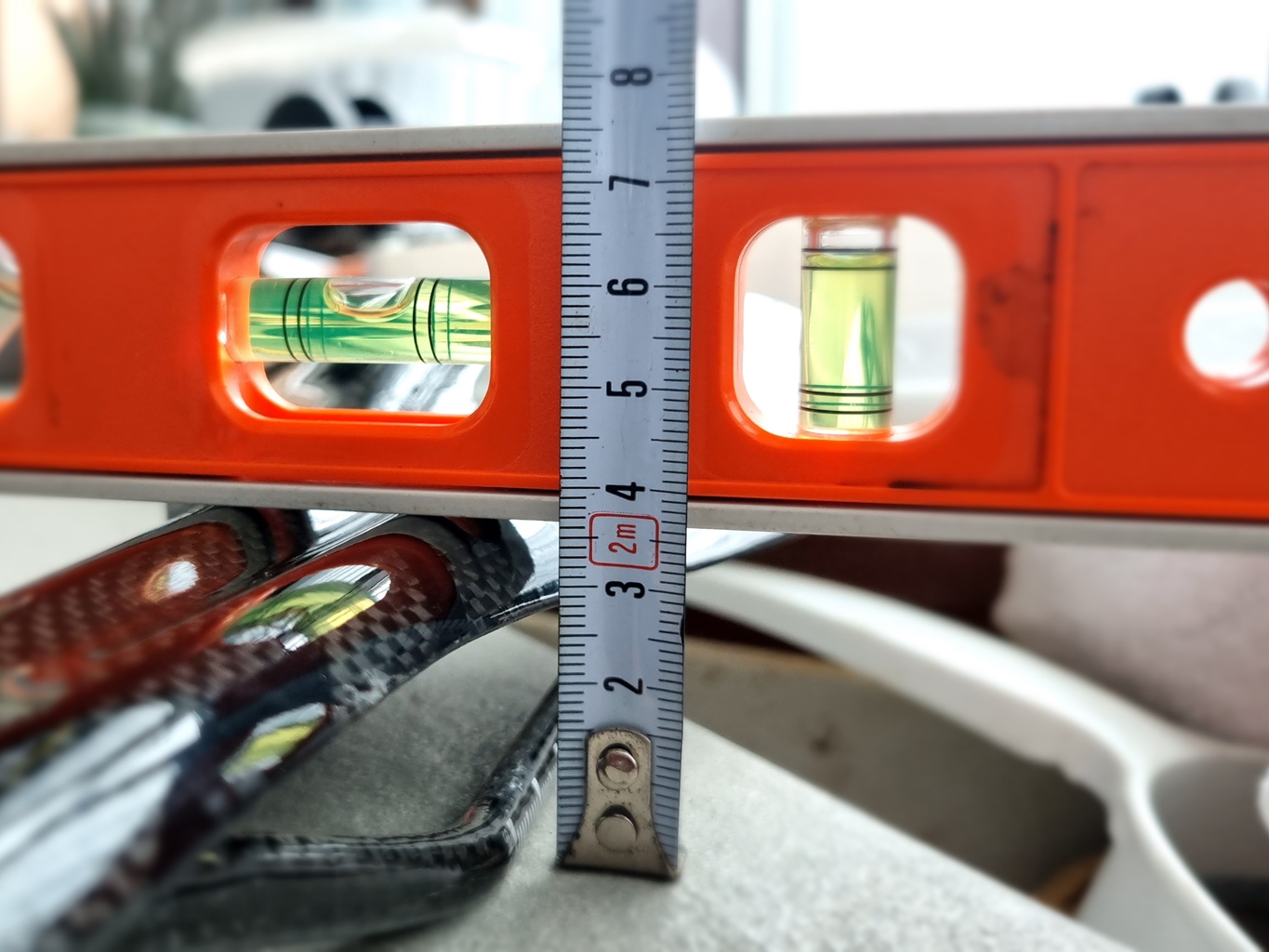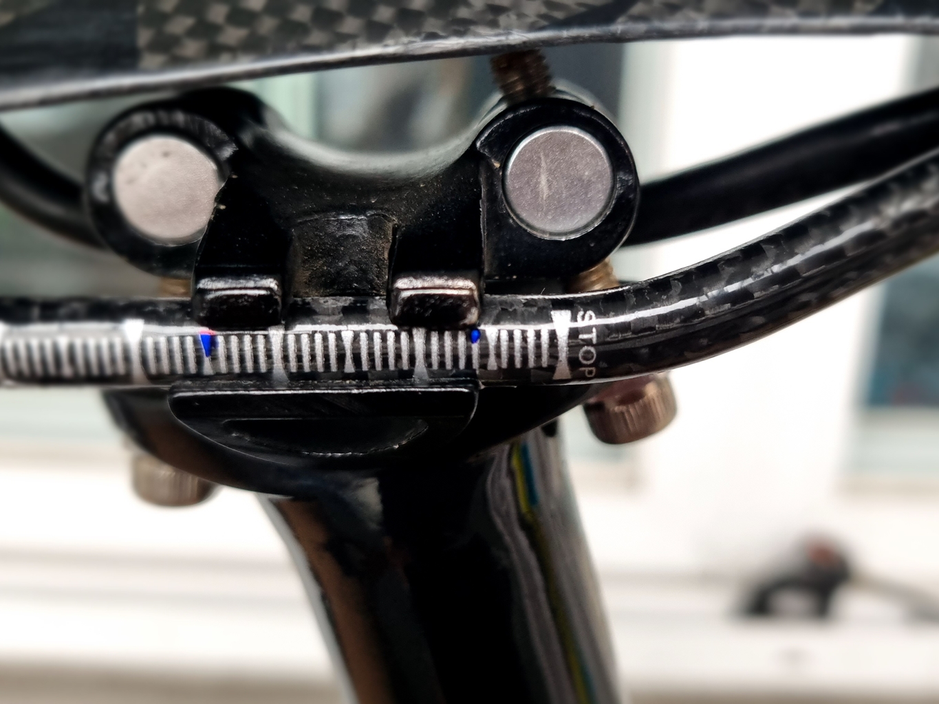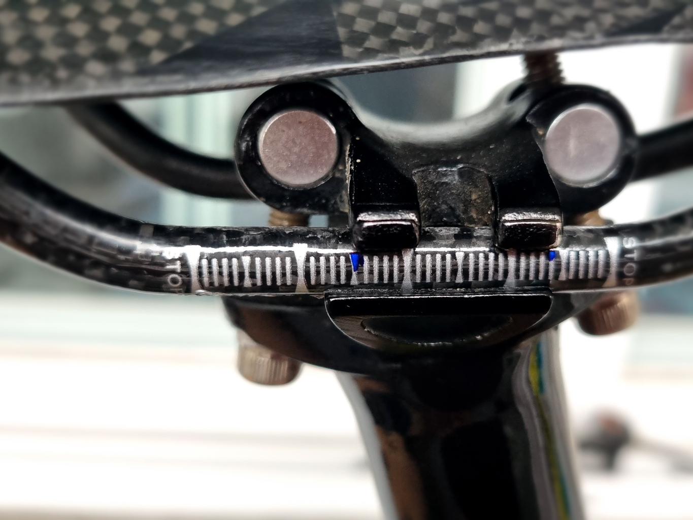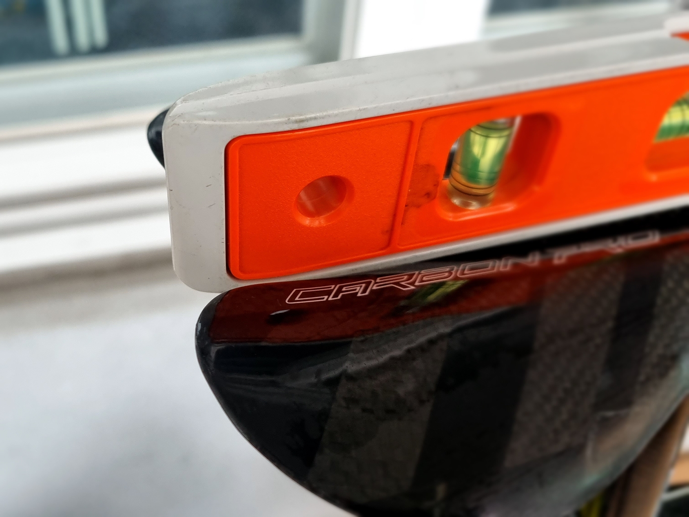 교체 전 나중을 위해 수평 잰 위치 기준 잡았는데 안장 끝부분과 일치 시킨 후...