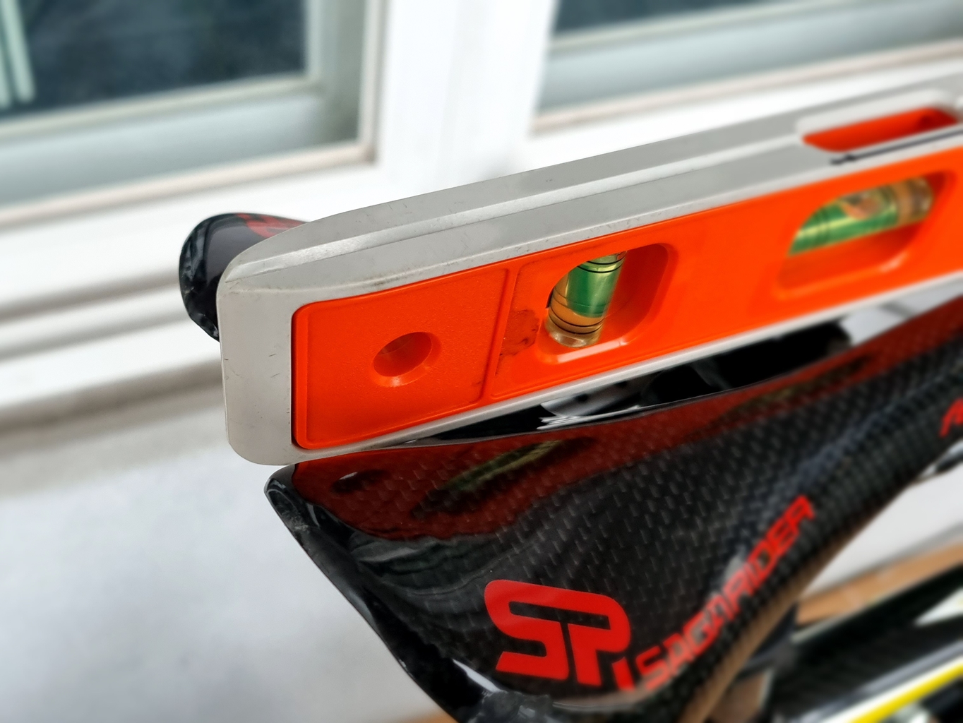 교체 후 나중을 위해 수평 잰 위치 기준 잡았는데 역시나 안장 끝부분과 일치 시킨 후...