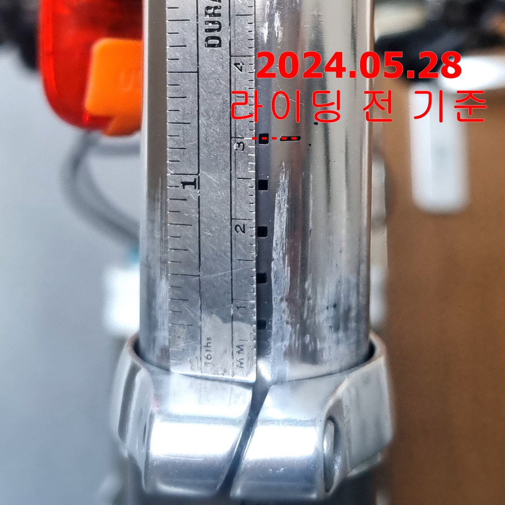 라이딩 후 돌아와 싯포스트 위치 재 보니 라이딩 전 기준에서 3.5mm 내려 짐...