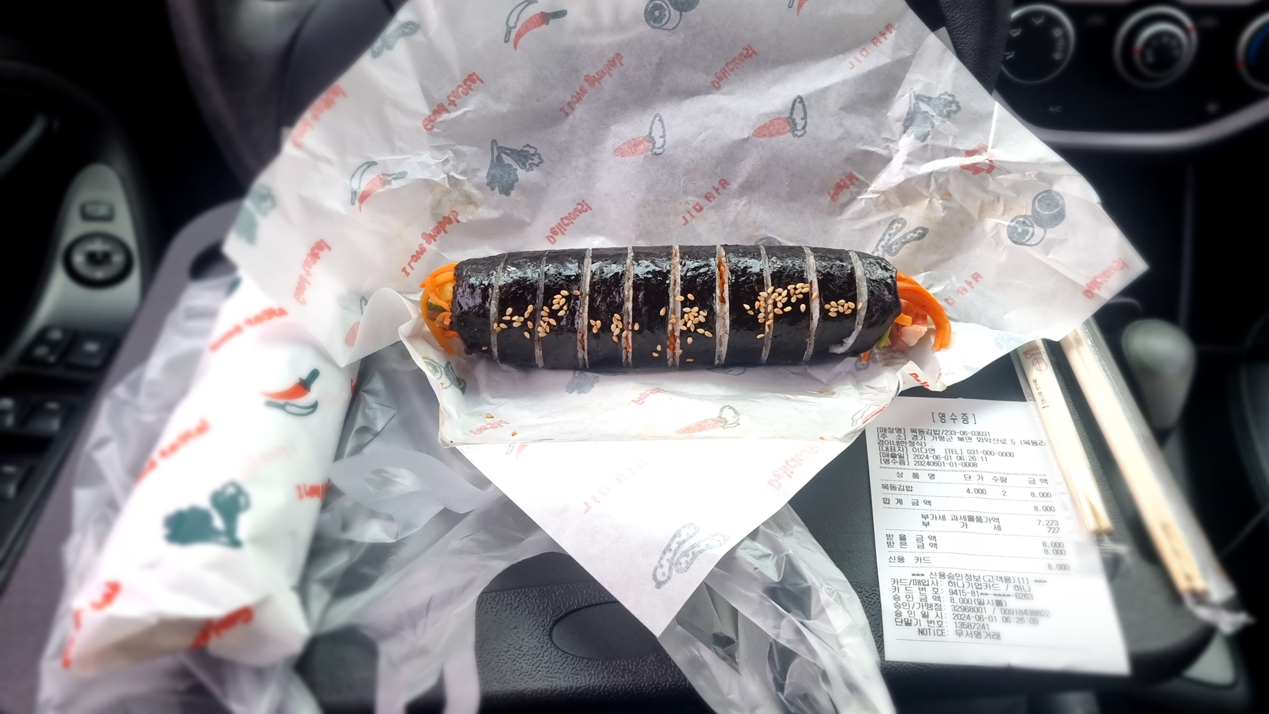 북면생활체육공원 근처 김밥 집에서 김밥 두줄 구입 후 북면행전복지센터 옆 주차장으로...