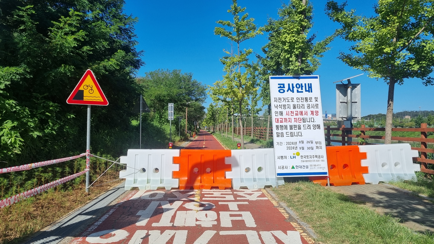 아라뱃길 남단 계양대교에서 시천교까지 낙석방지 울타리 공사로 막아 놓음...