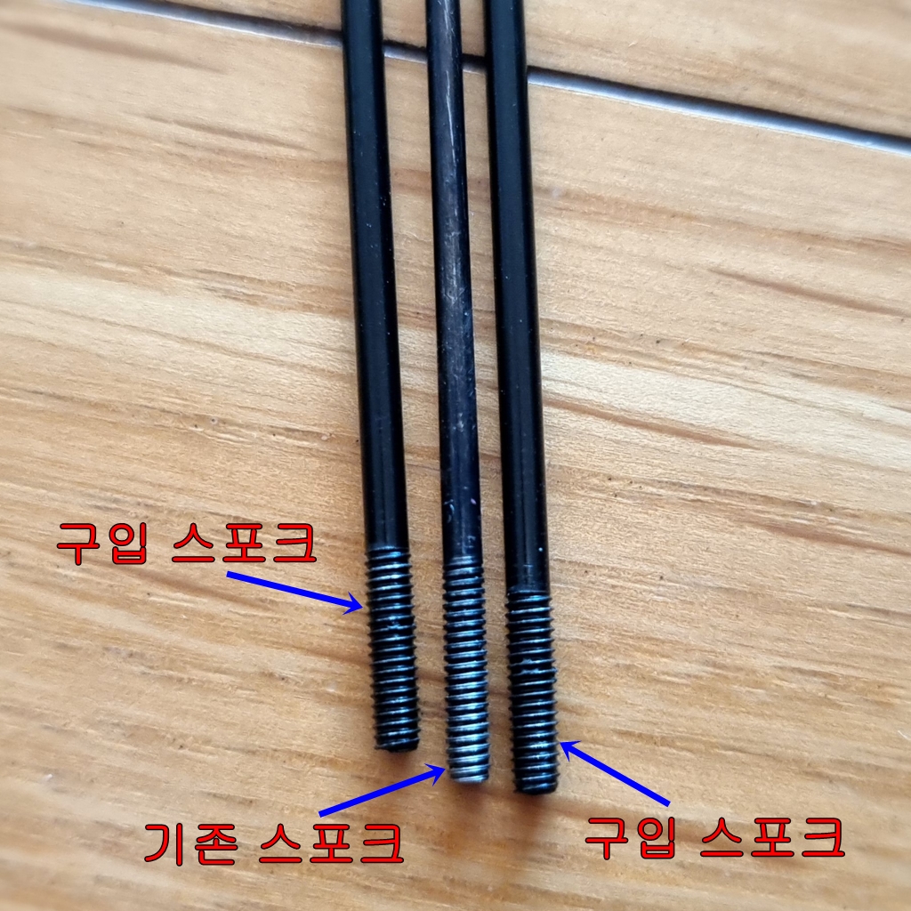 기존 스포크와 구입 스포크 굵기 사진으로 표현...