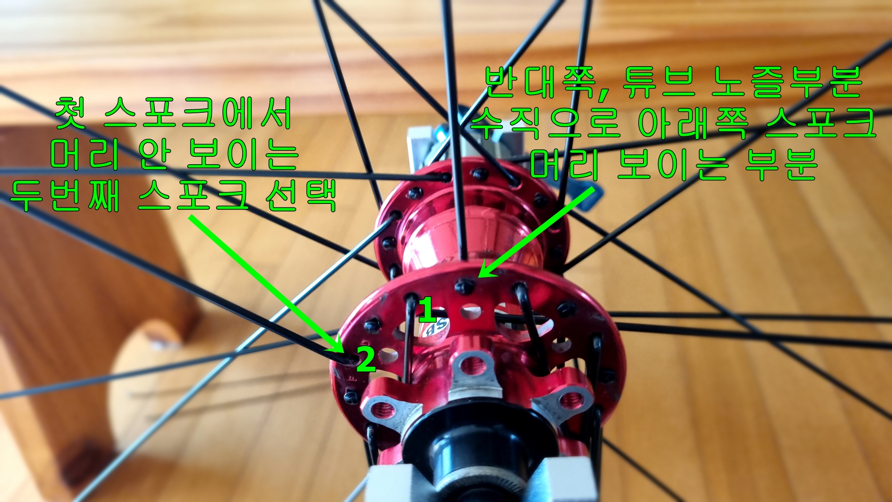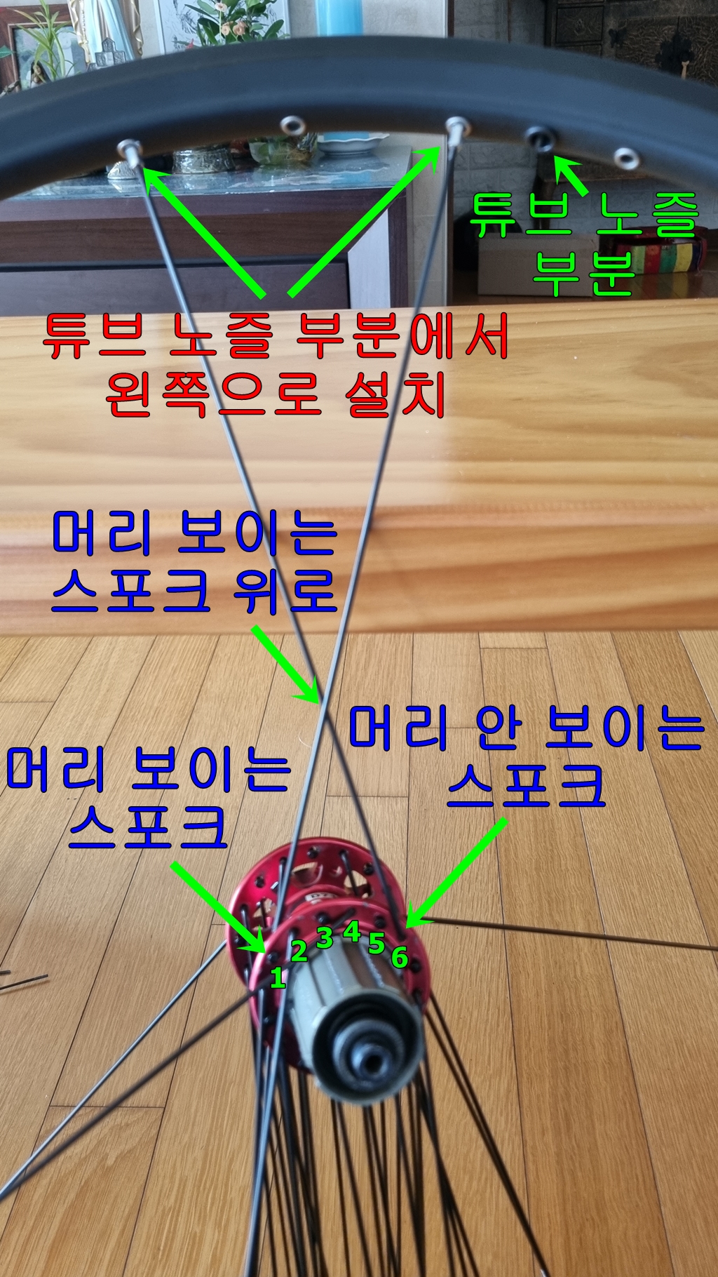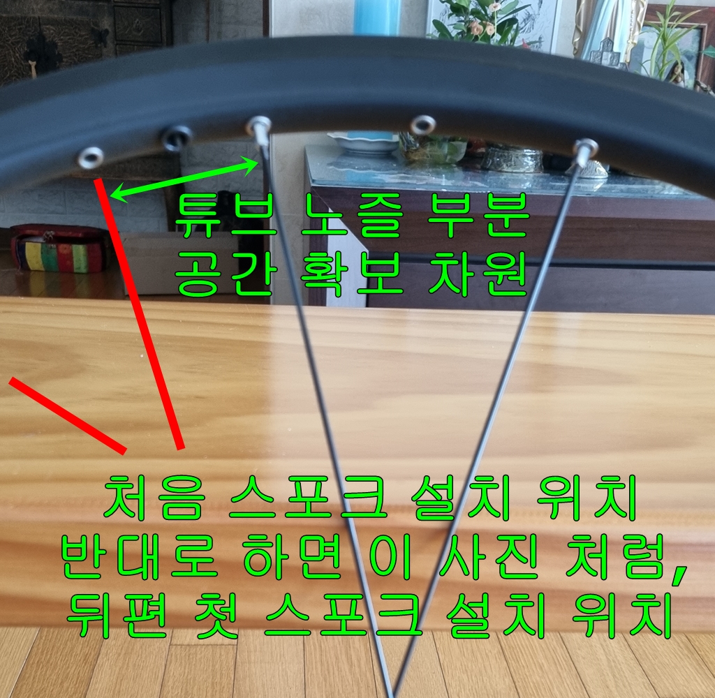 첫 스포크 설치는 튜브 노즐 부분 왼쪽으로 하나 건너 설치...