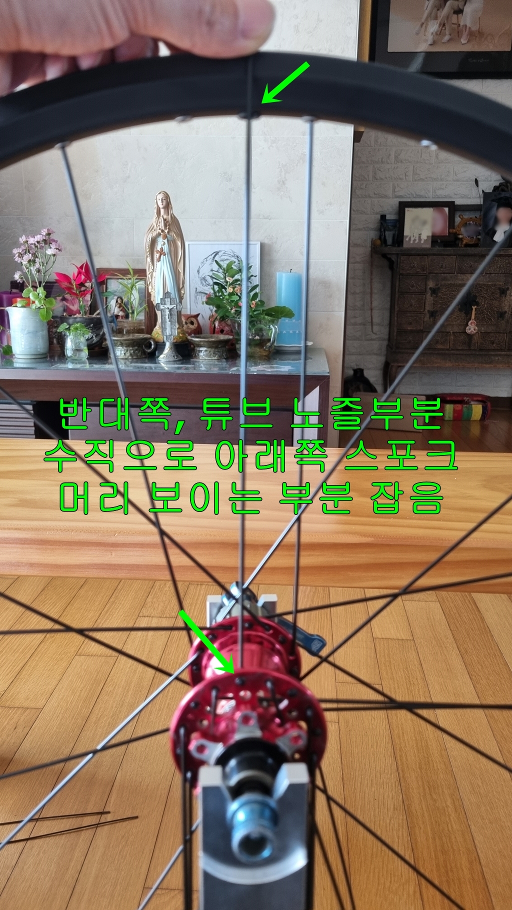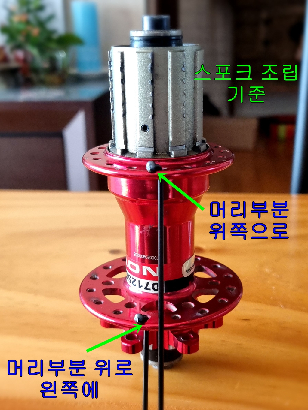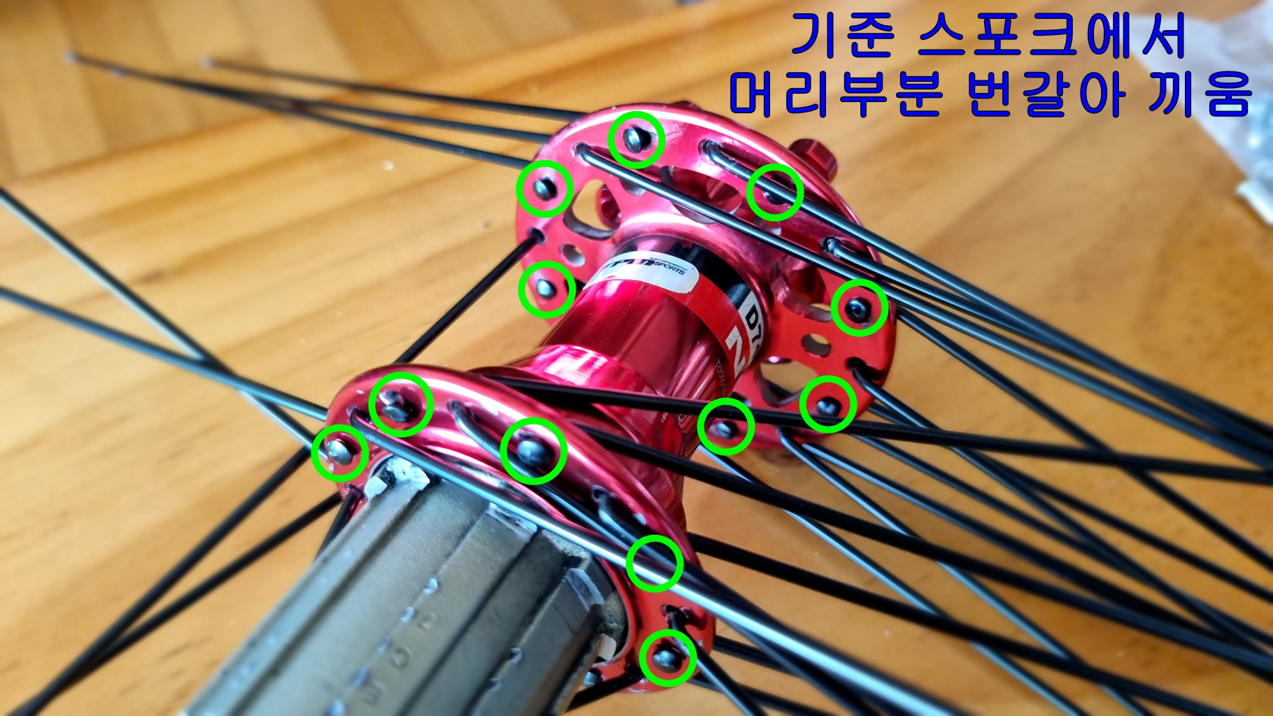 첫 스포크 설치는 튜브 노즐 부분 왼쪽으로 하나 건너 설치...
