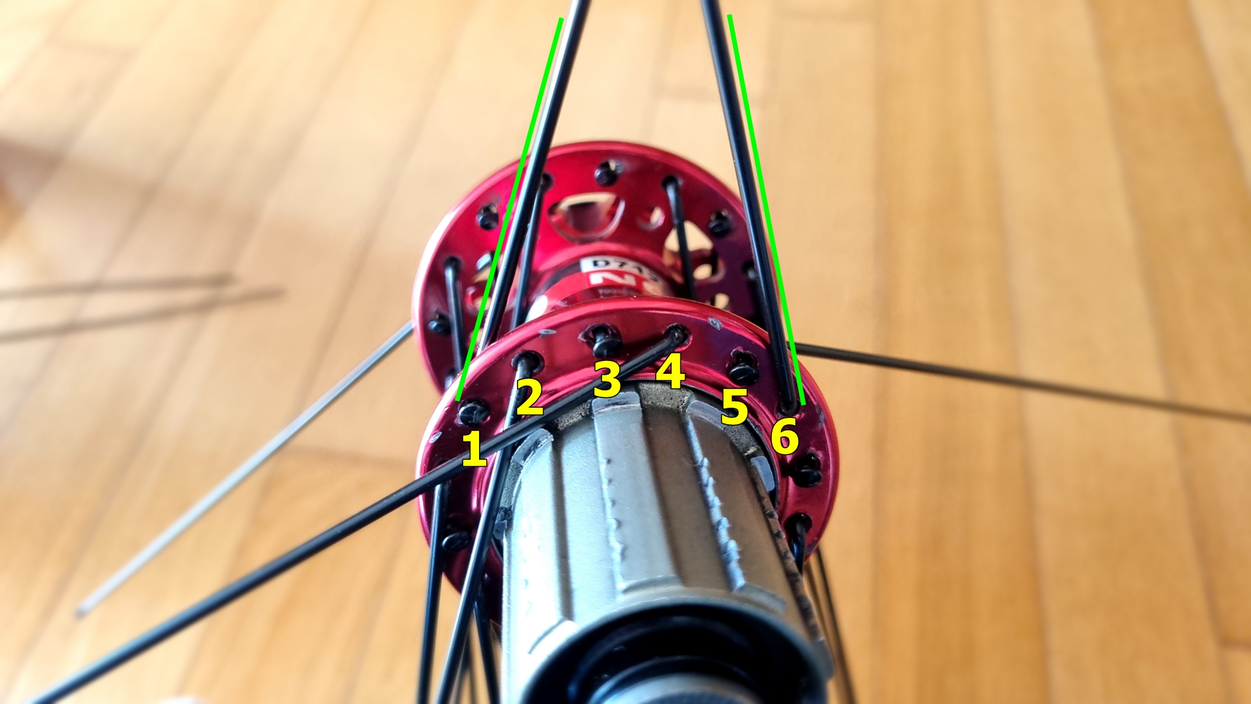 머리 보이는 스포크와 안 보이는 스포크 1번과 6번 잡고...