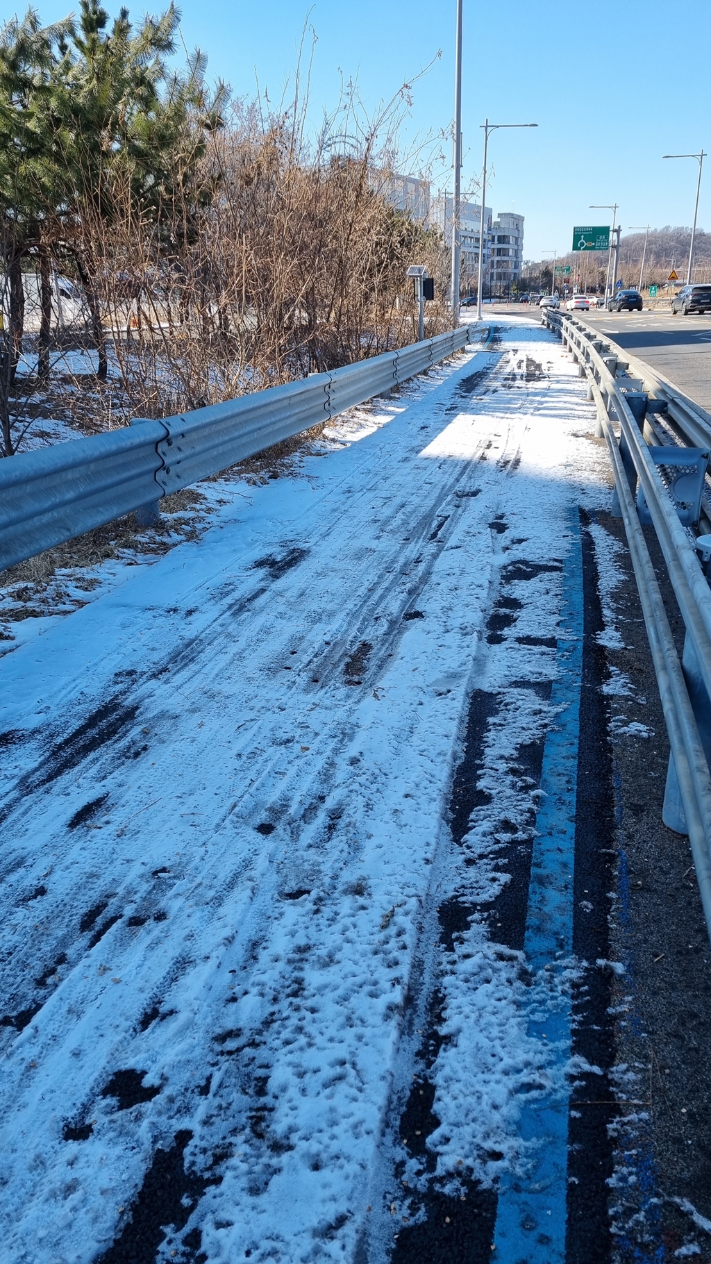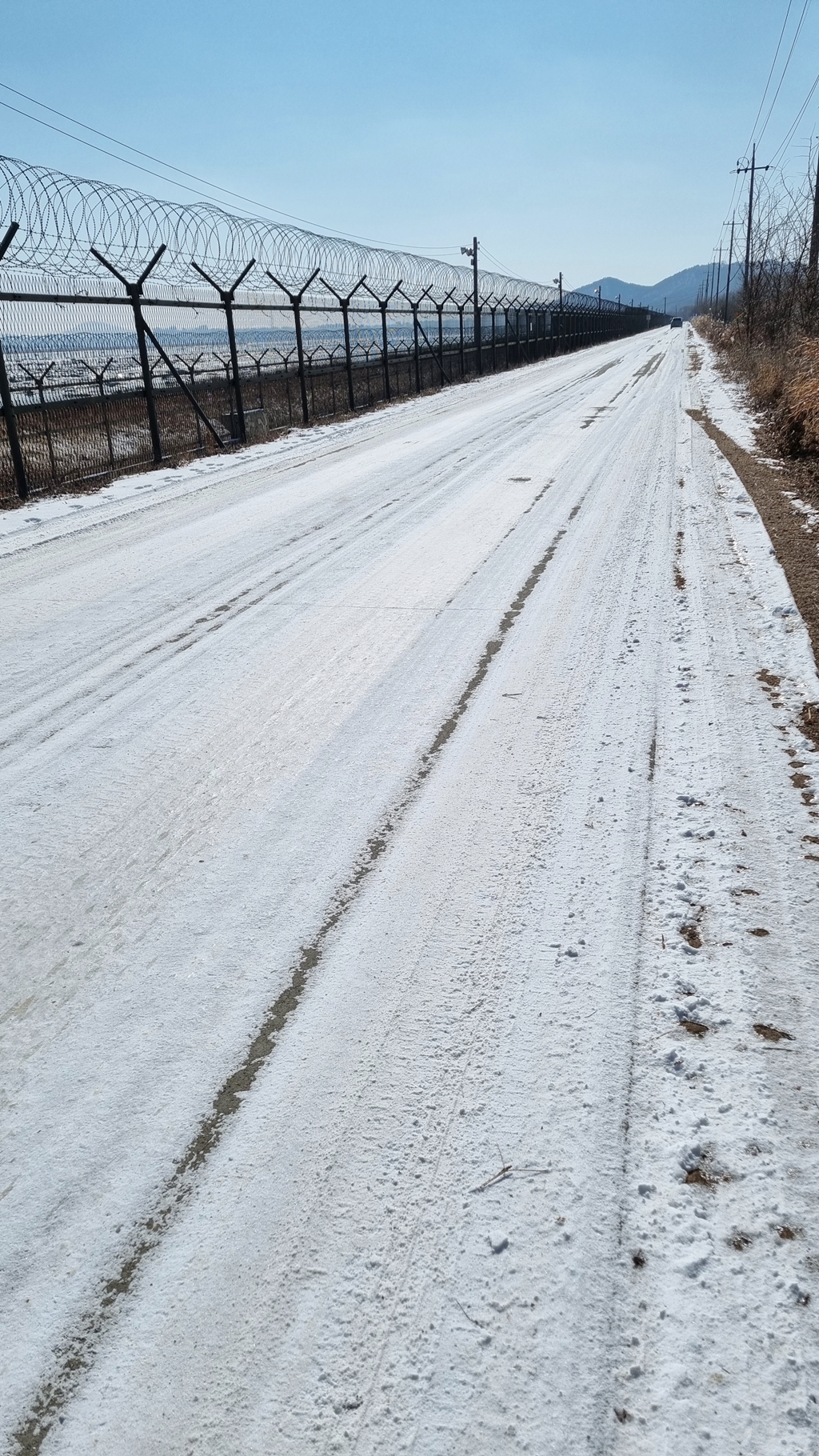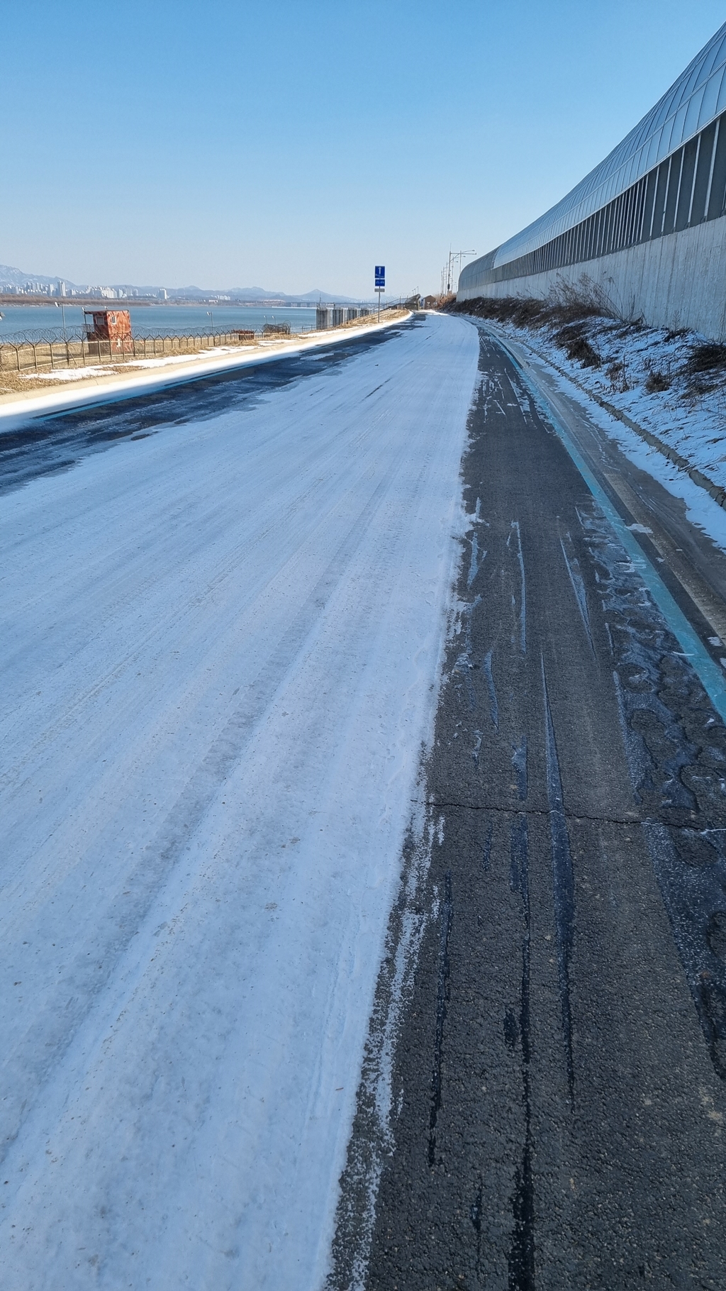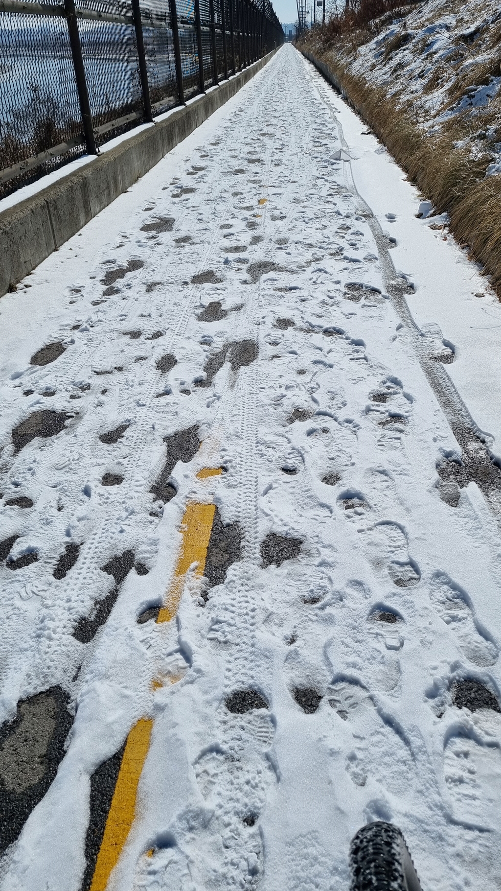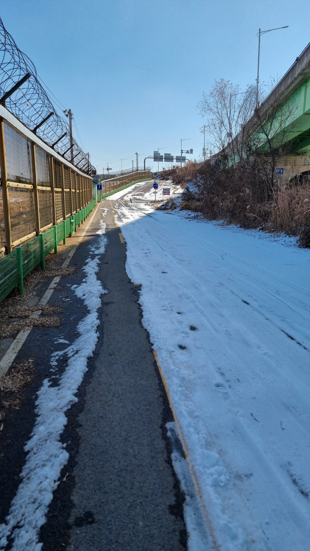 김포 운양동 지나 철책 옆 자전거도로는 많은 곳에 눈이 있었으나...