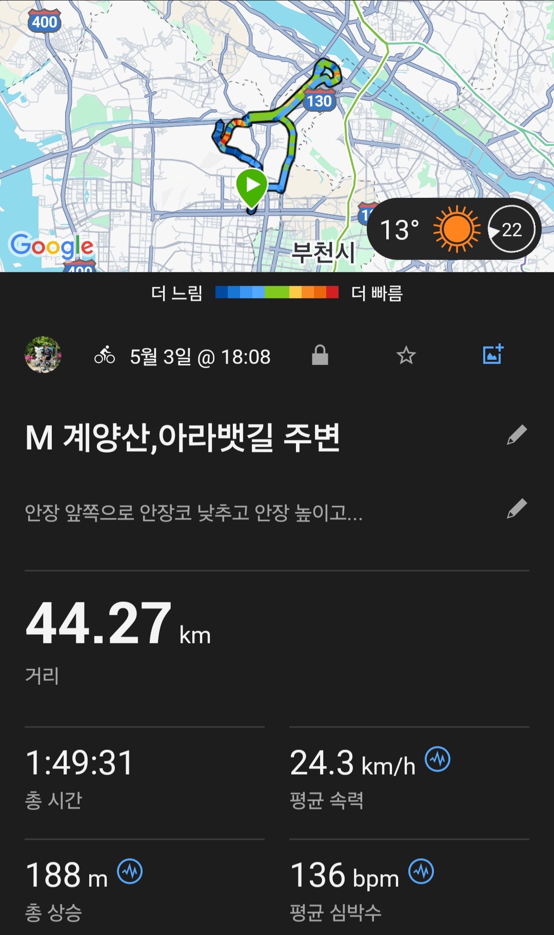 2025.05.03(토) 계양산,아라뱃길 주변 라이딩... (44.27Km)
