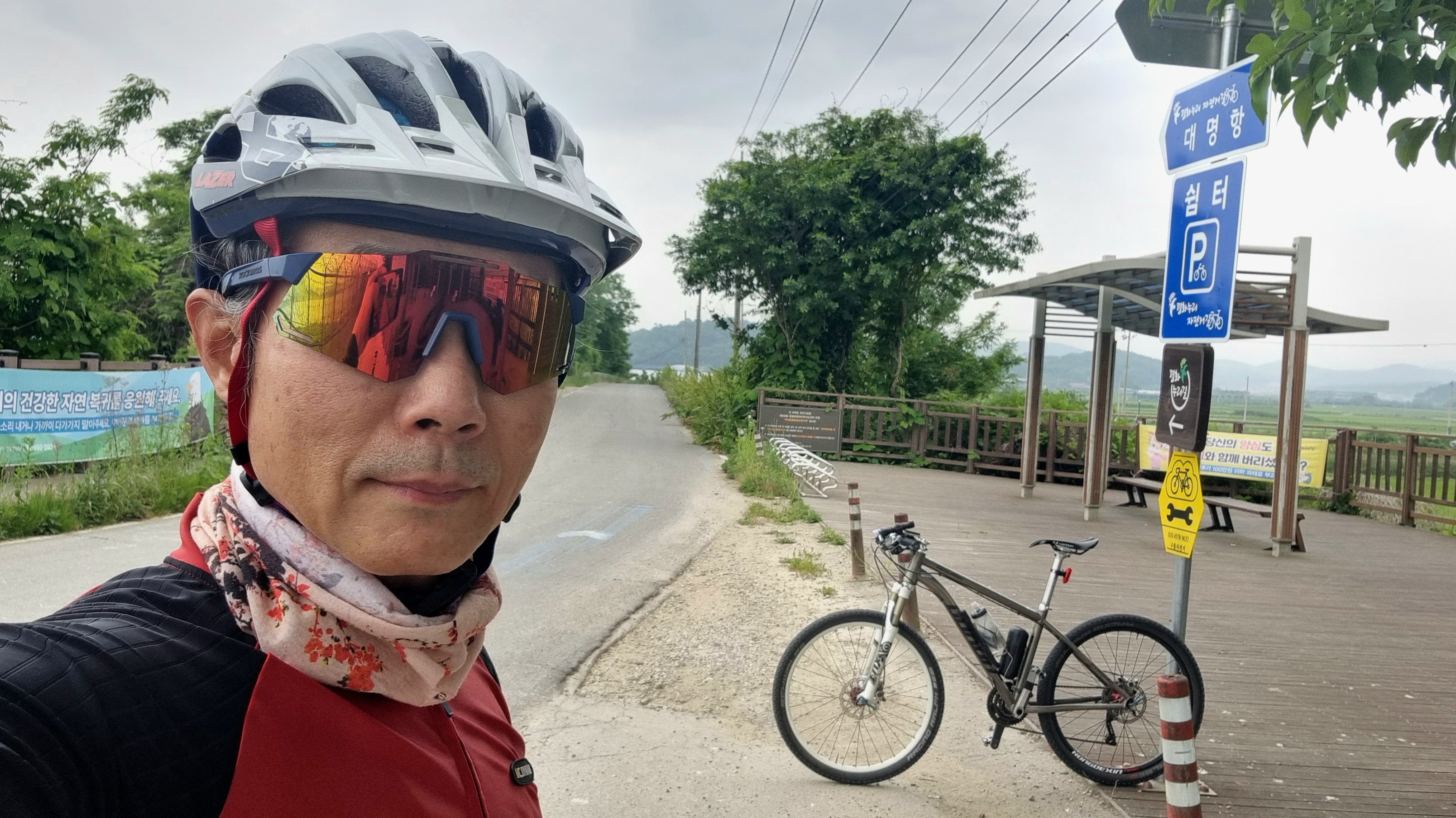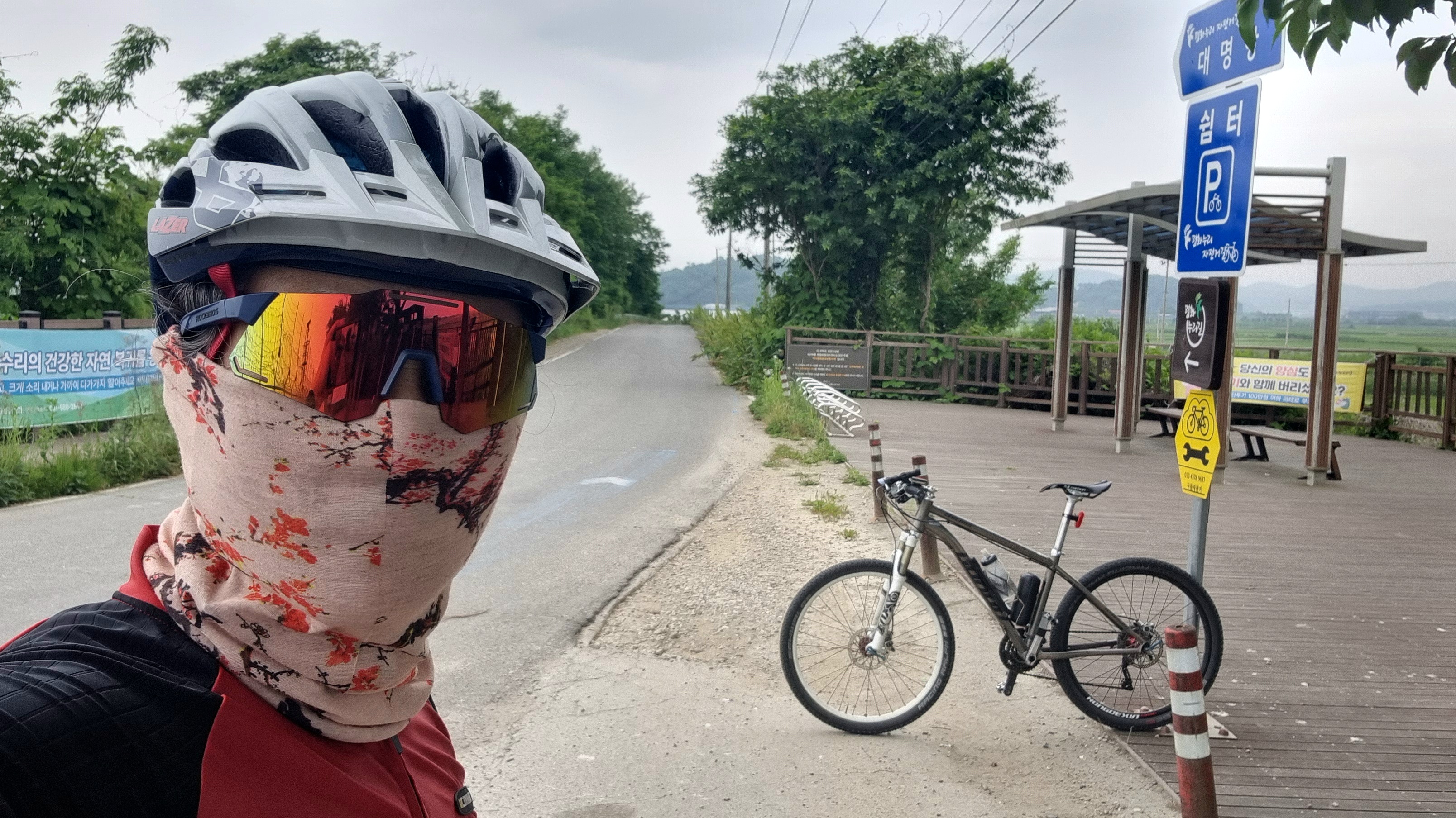라이딩 내내 흐렸는데 색있는 미러고글까지 착용하다보니 어둡다는 느낌...